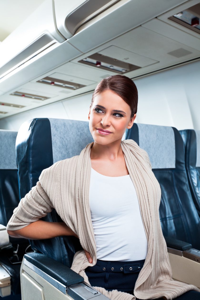 Tighten your buttock and thigh muscles for 10 seconds then relax them for 10 seconds. Repeat this 3 times every 1-2 hours to reduce soreness in the muscles  as well as help your circulation during the flight. You can also use the same technique with squeezing your shoulder blades and pushing your elbows back into your seat to relieve your upper back muscles.
